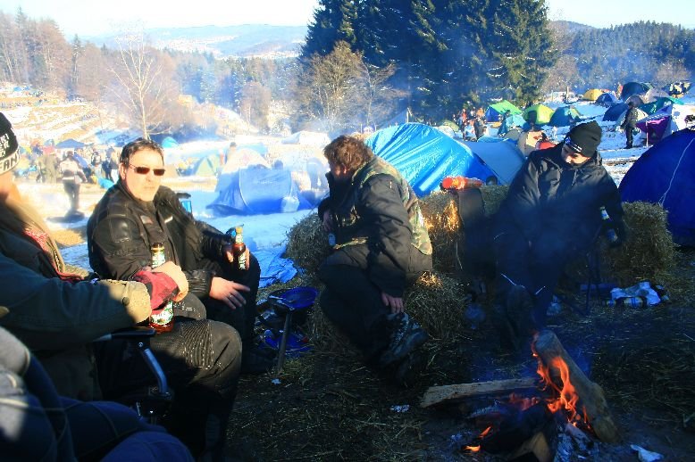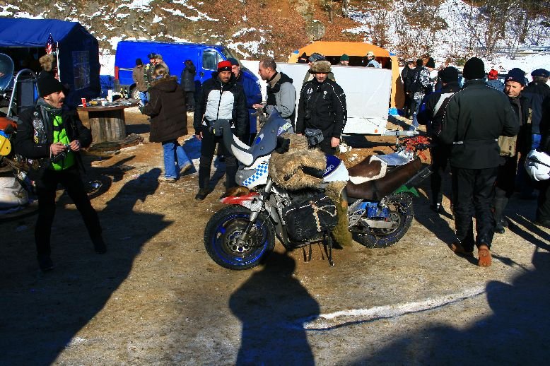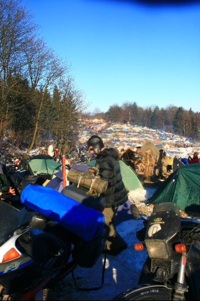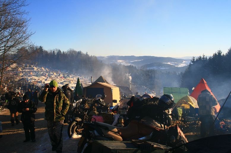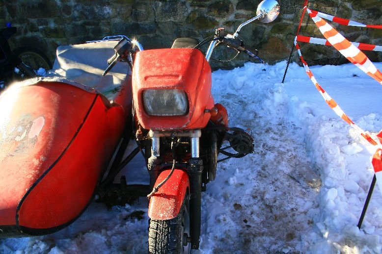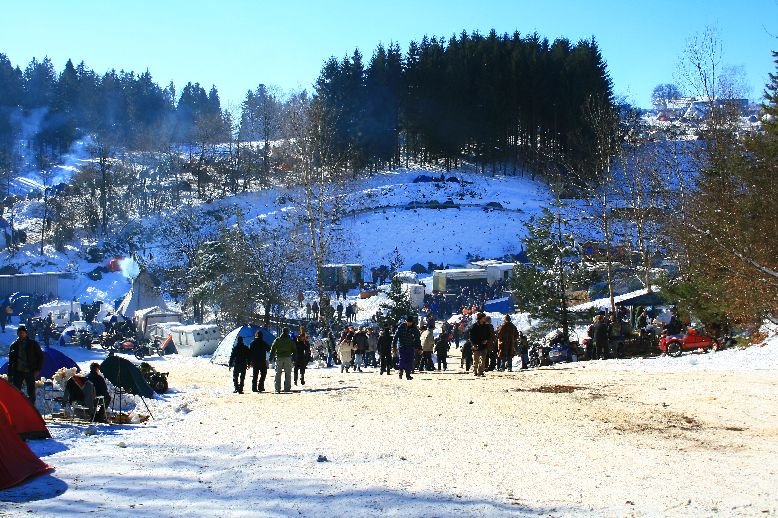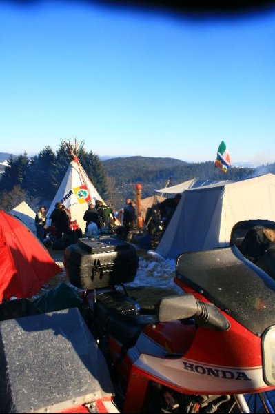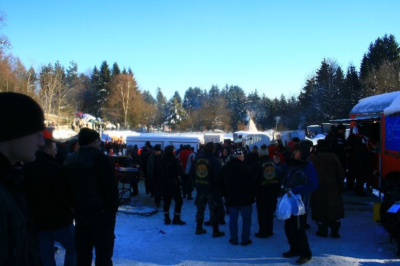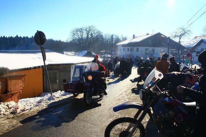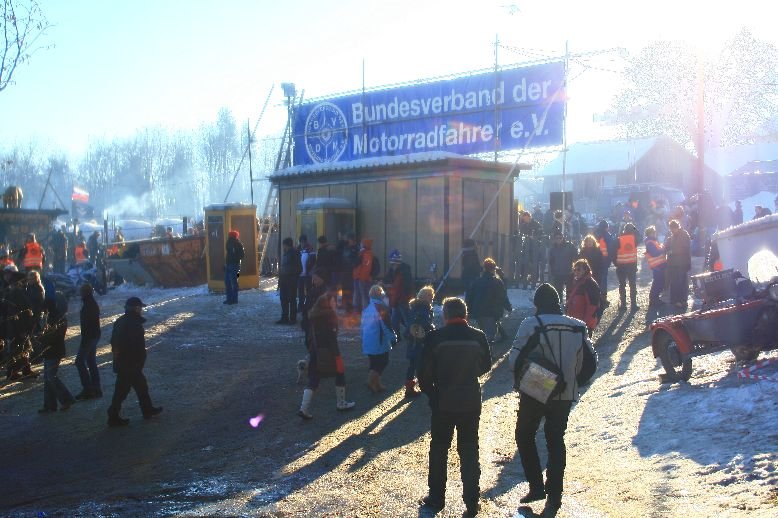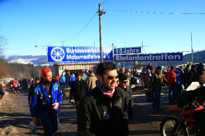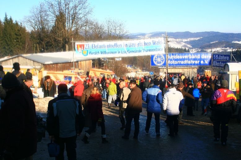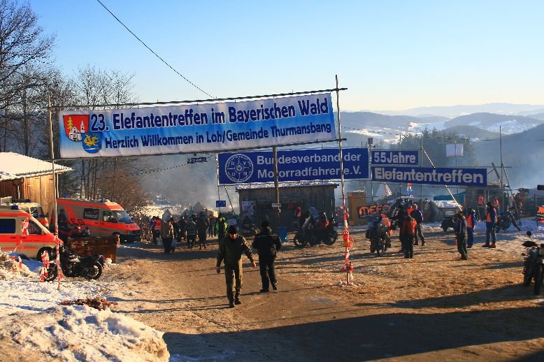 Nachdem nun das Moped wieder komplett für die Abreise nach Solla / Loh war, konnte es am Freitag nun endlich losgehen. Die Telefonlisten waren ausgetauscht, das Moped startklar und sogar ein Mitstreiter war gefunden – also alles Bestens. Es war seit Jahren wieder das erste Mal, das ich einen Mitfahrer für das Treffen gefunden hatte. Letztes Jahr hatte wohl das Wetter mit Schneefällen am Donnerstag und Freitag den Einen oder Anderen abgehalten dann doch noch zu kommen. Nach anfänglichem Schneeregen bis Stuttgart entwickelte sich die Anfahrt zu einer reinen Spazierfahrt nach Solla ohne besondere Hindernisse. Die Vorhersagen einiger, dass das Elefantentreffen wegen der Winterreifenpflicht für Motorräder vor dem AUS steht, bewahrheiteten sich nicht. Auch dieses Jahr waren in etwa gleich viele Motorradfahrer wie in den vergangenen Jahren da. Den vielen verschiedenen Diskussionen in diversen Internet – Motorrad – Foren konnte man fast vermuten, das beinahe jeder mit seinem Motorrad auch im Winter unterwegs sei. Dies scheint aber nicht ganz so zu sein. Denn auch dieses Jahr konnte ich viele bekannte Gesichter aus den vergangenen Jahren wieder finden. Die Anderen kommen sicher nächstes Jahr, wenns wieder heißt auf zum Elefantentreffen.