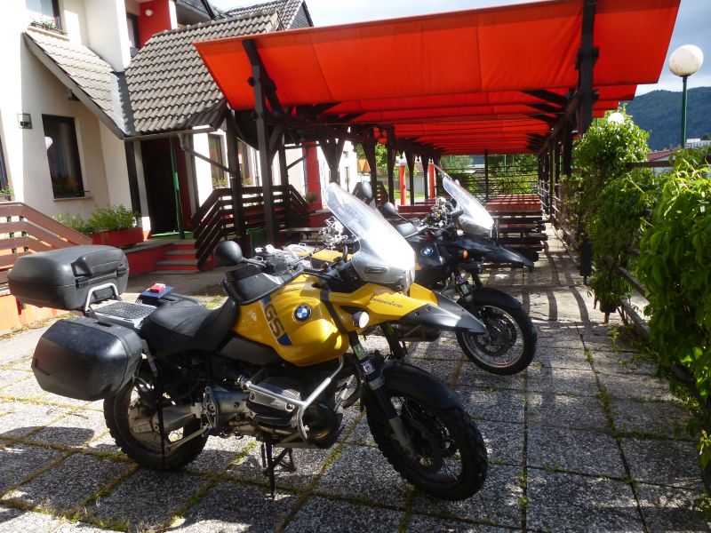 Ruckzuck waren wir in Kocevje. Laut Navi gibt’s hier genau 2 Hotels. Das erste hatte wie schon beinahe üblich geschlossen, das Zweite hatte gerade eben so offen. Also nix wie rein. Parken konnten wir auf der Terrasse – klar wo denn sonst.