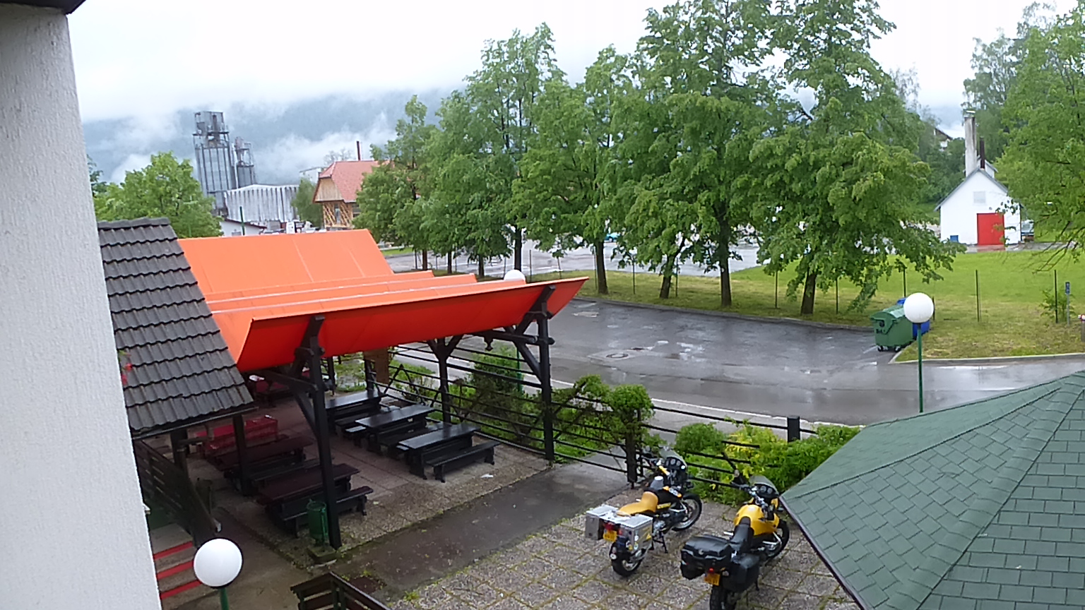 Als wir am 4. Tag aufgestanden sind hat es – na was wohl – geregnet. Davon hatten wir ja schon in den Anfansgtagen schon eine ganze Menge gehabt. Deswegen hat sich bei meiner Freundin auch ne Bronchitis eingefunden. Im Anbetracht dessen, haben wir kurzerhand noch um eine Übernachtung verlängert. Ich habe mir derweil mal den WLAN Zugang gesichert um den Wetterbericht zu studieren. Also Notebook ausgepackt – und – festgestellt, dass das Netzteil noch im letzten Hotel in Österreich liegt. Na toll. Kurz angerufen und die Zusage gesichert ,dass das liegengelassene Netzteil zu mir nach Hause geschickt wird. So, deswegen habe ich aber jetzt kein Netzteil. Den Tag Zwangsaufenthalt wollte ich nutzen um mir ein neues Netzteil zu besorgen. Den Wirtsleuten habe ich mein Problem geschildert. Kurzerhand fuhr mich eine Freundin der Wirtsleute in ein Elektrogeschäft. Der Inhaber liess alles stehen und liegen und schaute seinen Laden durch – Ergebnis negativ. Passt wieder alles. Das war nämlich der erste und einzige derartige Laden im Umkreis von 50km. Meine Chauffeurin lud mich erst mal zum Kaffee ein, welches zweckmässigerweise genau nebenan war. Dort saß ein Bekannter von ihr. Als er mein Problem hörte, fing er sofort an zu telefonieren. Nach dem Gespräch meinte er: „In 3-4 Stunden hast Du Dein Netzteil“. Nachdem Kaffee gings wieder ins Hotel.